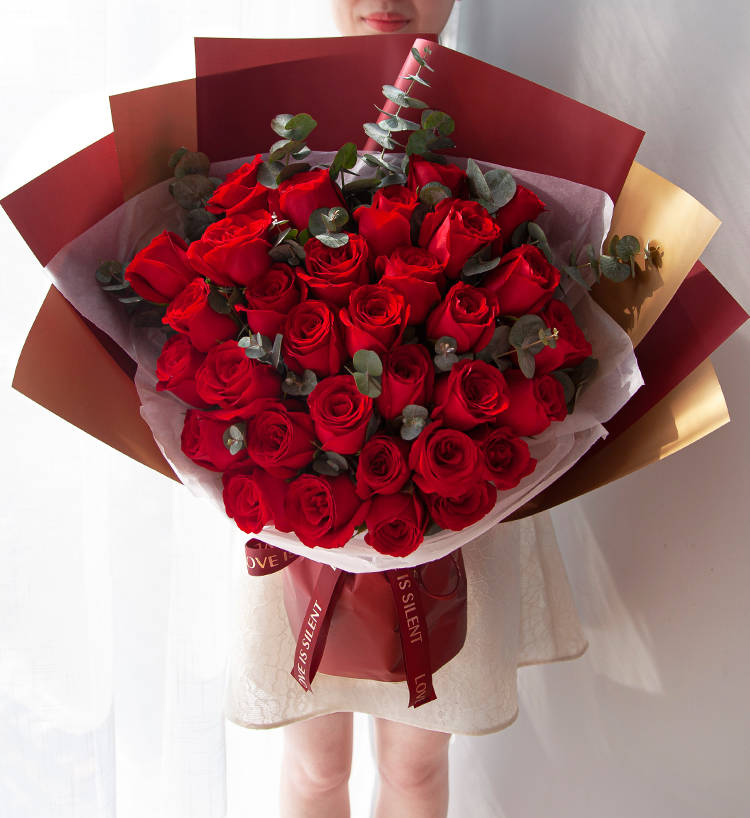 - 花材:卡羅拉玫瑰33枝、尤加利10枝