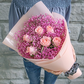 粉色滿天星+粉玫瑰插花