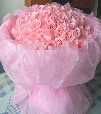 百麗鮮花網上這款“愛你久久”,99枝粉玫瑰,粉色紗網包裝