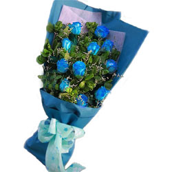 【花材】:11枝頂級藍玫瑰,情人草、綠葉點綴