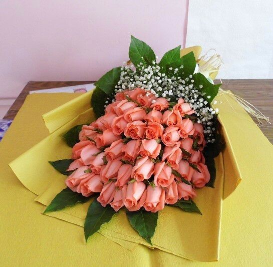 粉玫瑰代表感動、愛的宣言,淺黃色的包裝,大方又顯優(yōu)雅