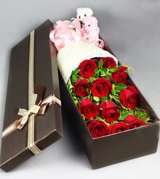 花材:11支紅玫瑰,梔子葉、黃鶯豐滿(mǎn)搭配,2只小熊;包裝:白色紗網(wǎng)扇形包裝,粉色蝴蝶結(jié)。咖啡色長(zhǎng)方形花盒;鮮花花語(yǔ):任時(shí)光匆匆流去,我只在乎你…