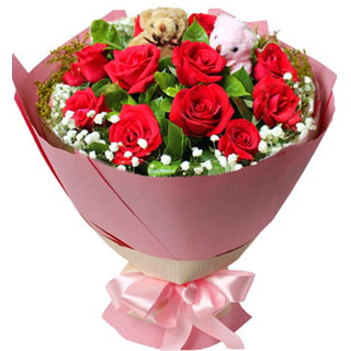 花材:11朵紅玫瑰,梔子葉、滿天星間插,2只小熊包裝:淡粉色牛皮紙/瓦楞紙包裝,粉色花結;鮮花花語: