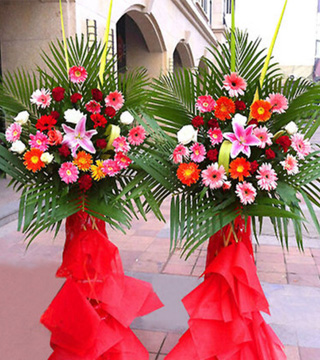 花材:各色扶郎花,1支多頭粉百合,散尾葵、劍葉(數量:1個)包裝:1.6米高開業花藍(數量:1個);