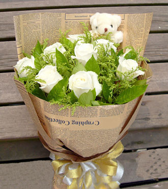 花材:11支白玫瑰,黃鶯綠葉搭配,1只小熊。包裝:英文報紙圓形包裝,金色蝴蝶結。;鮮花花語:推開窗親吻空氣 開始一天的美麗心情 陽光暖暖的 給你清新雅致的心情