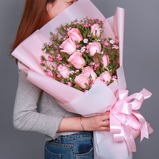 花材:11朵戴安娜玫瑰包裝:粉色霧面紙扇形包裝,精美花結;鮮花花語:心中浮現你美麗的容顏,愛你的心永遠不會改變,手牽著手踏過海角天邊,你幸福的笑臉告訴我,就是我愛的彼岸