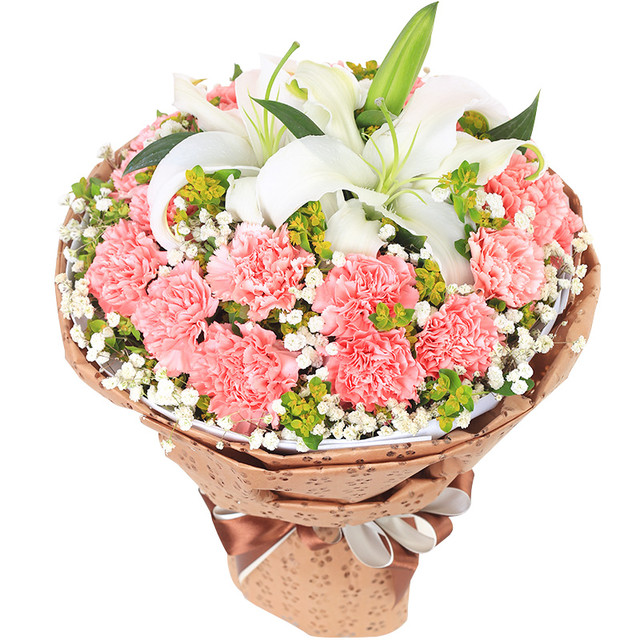 花材:19朵粉色康乃馨,1枝香水百合,滿天星