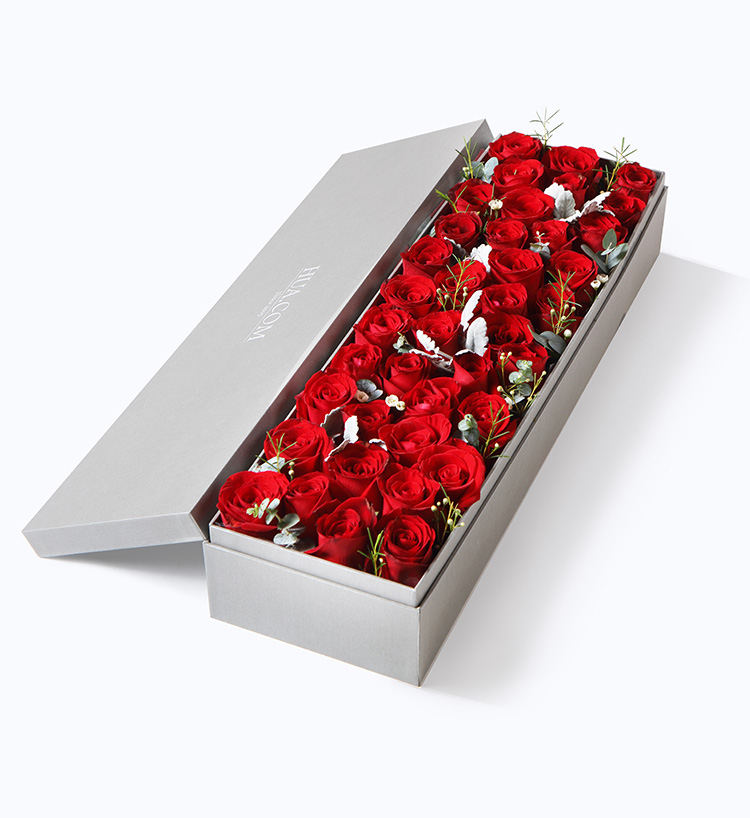 花材:紅玫瑰39枝,搭配白色臘梅、尤加利、銀葉菊少量,搭配白色臘梅、尤加利、銀葉菊少量