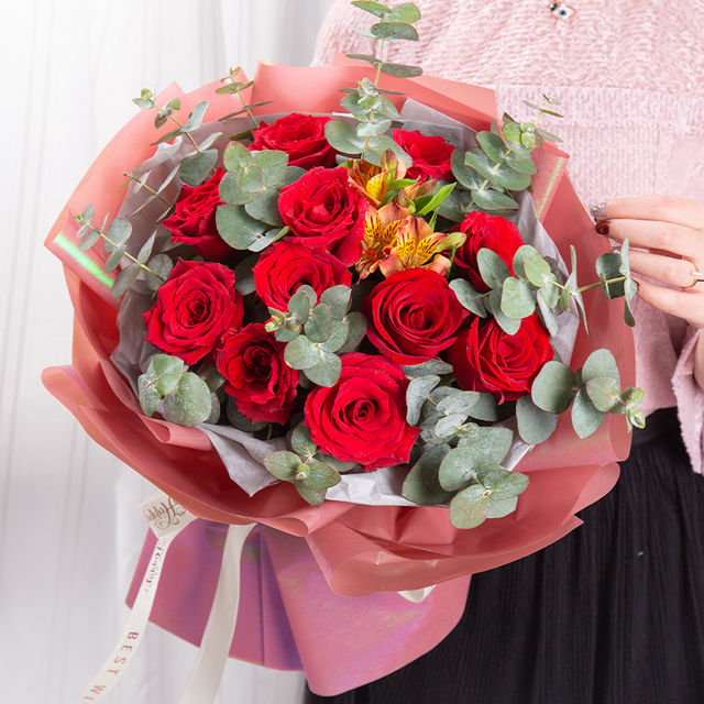 花材:11枝紅玫瑰,搭配尤加利葉、橙色水仙百合