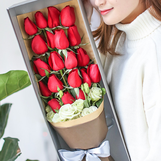 花材:19支紅玫瑰,搭配3支淺綠色洋桔梗、1支粉色洋桔梗、適量尤加利葉裝飾。