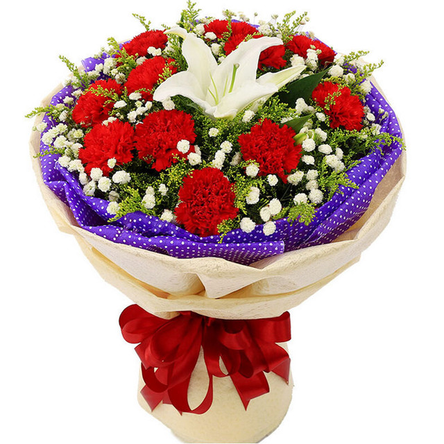 花材:11枝紅色康乃馨,1枝香水白百合,滿天星、黃鶯、梔子葉