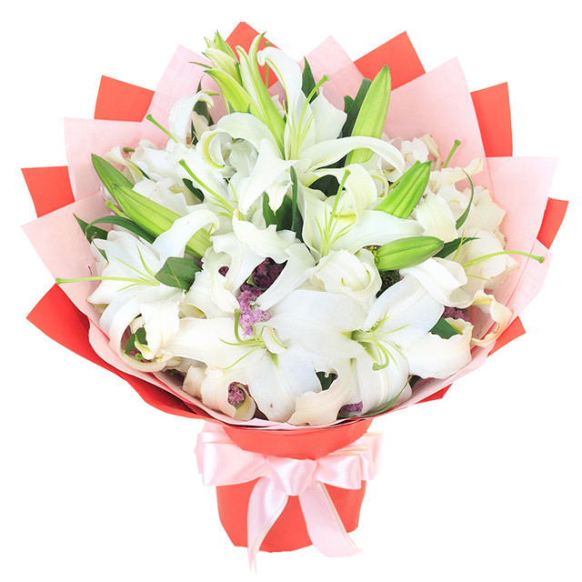 花材:11枝香水白百合,勿忘我