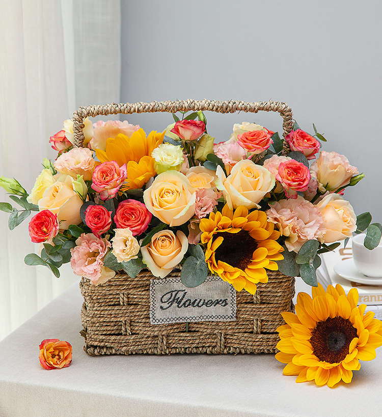 花材:香檳玫瑰11枝、向日葵2枝、香檳色洋桔梗3枝、橙色多頭玫瑰2枝、尤加利葉5枝