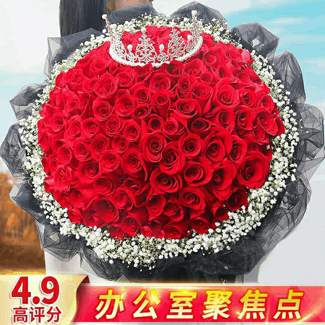 花材:99枝卡羅拉紅玫瑰,搭配白色滿天星,1個皇冠(皇冠款式隨機(jī))