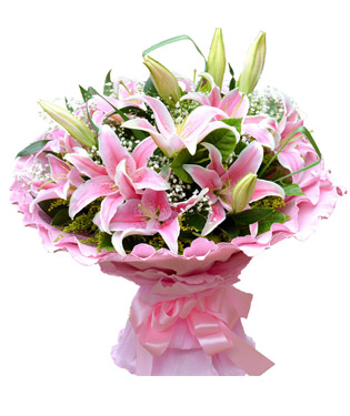 【花材】:6枝多頭粉色百合,搭配黃鶯 滿天星 綠葉