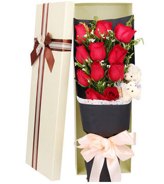 花材:11朵紅玫瑰,一對小熊,搭配相思梅、黃鶯包裝:黑色硬紙托底包裝,白色緞帶蝴蝶結(jié),高檔精美禮盒。;鮮花花語:你是我童話里的白雪公主,我就是你今生今世的愛情奴仆
