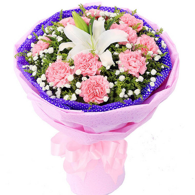 花材:11枝粉康乃馨,1枝香水白百合包裝:紫色波點禮品紙內襯,粉色禮品紙外包,精美蝴蝶結;鮮花花語:世間有一種東西叫愛,自吸引中誕生,升華中融洽