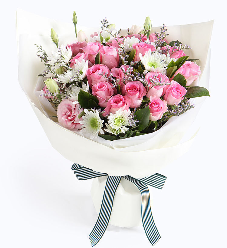 花材: 蘇醒玫瑰19枝,粉色桔梗2枝,白色小菊4枝,情人草5枝,梔子葉5枝,