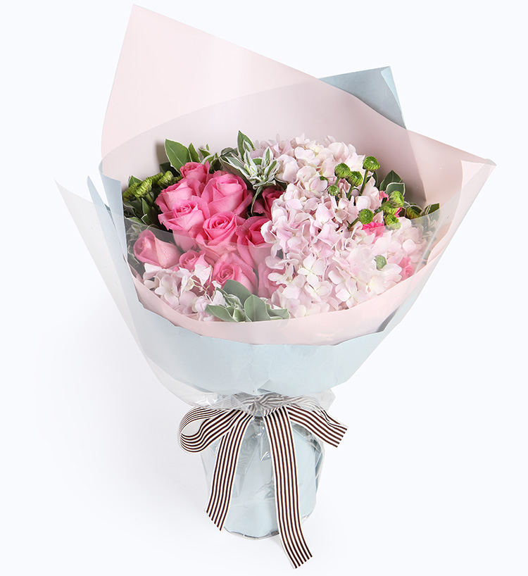 包裝:內層粉色opp霧面紙 外層藍色絕色紙 透明玻璃紙 白咖細羅紋帶