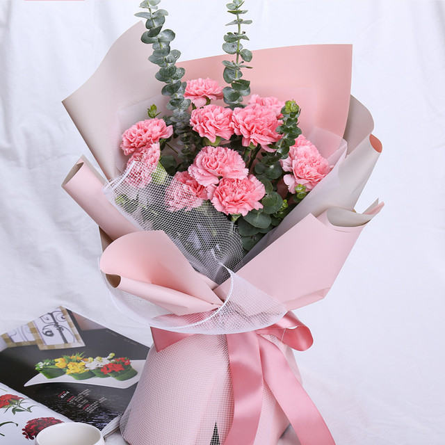 花材:11枝粉色康乃馨,搭配尤加利葉